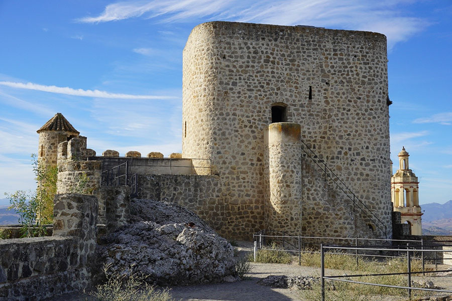 Torre del Homenaje. Gran torre de planta rectangular (10’5 x 5’5 m) con las esquinas redondeadas y situada en la cota más alta del castillo. En su interior existen dos cámaras cubiertas con bóveda de cañón. Los ángulos redondeados de la torre le imprimen un carácter peculiar, siendo propio del momento de la reforma nazarí, aunque su origen podría remontarse al siglo XII. Está construída en mampostería con hiladas trabada con argamasa de cal y arena. Actualmente tiene dos puertas. Una, moderna, en la fachada Este, abierta tan solo para permitir el paso a los visitantes. La puerta original se halla en el lienzo Norte, pero a 6 m de altura, comunicando directamente con el primer piso. Quedan restos de enlucido rosa y encofrado de cañas. El piso inferior estuvo dividido en dos habitaciones separadas por un muro de 0’50 m. Se llega a la planta superior por una escalera de doce escalones iluminada por una ventana. También estuvo dividida en dos habitaciones. Cuenta con chimenea que conecta directamente con la terraza a la que se accede mediante una estrecha escalera de caracol. Sus únicos vanos son algunas aspilleras dispersas en su paramento. En el momento de nuestra visita (octubre 2025), albergaba una exposición de obras de arte.