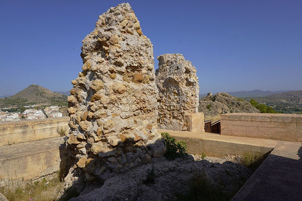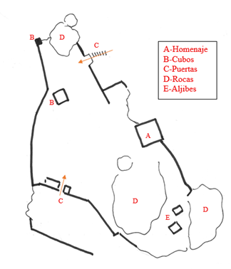 Castillo roquero de planta irregular adaptada al espacio disponible entre las rocas. Ocupa una superficie aproximada de 4.800 m2. No han quedado restos de su interior, por lo que no se le aprecian recintos, a excepción del pequeño apéndice meridional. En el punto más elevado está la torre del Homenaje, de planta cuadrada con 12 m de lado y fábrica de tapial con gruesas piedras. Actualmente se ha consolidado y habilitado para las visitas, creando un estupendo mirador. Parece que contó con tres plantas. La única puerta del castillo se localiza al Norte y se cruza gracias a unas escaleras. En su interior tan solo podemos apreciar los restos de dos aljibes en su parte meridional. Todos los muros del castillo presentan la misma fábrica y se han reconstruído con los mismos materiales.