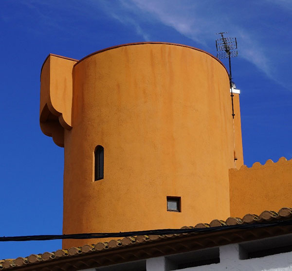 Torre de planta circular y forma cilíndrica, con 4 m de diámetro aproximado. Cuenta con dos vanos estrechos con arcos de medio punto. Posee un matacán.