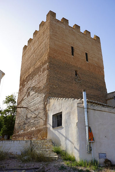 Torre de planta cuadrada, de 8 m de lado y altura original conservada próxima a los 9 m. aunque la intervención moderna ha duplicado esta altura. no obstante, se cree que en el momento de su construcción debió tener una altura similar pues ello explicaría el enorme grosor de sus muros (1’5 m). Construida mediante tapial de hormigón, cuenta con un recrecido visible de mampostería que se adosó cuando se le colocó el tejado. La puerta actual, a un metro de altura en el frente occidental, es moderna y sin valor, pero se piensa que está en el mismo lugar que la puerta antigua. Sus lados Norte y Este todavía están adosados a construcciones modernas y no se sabe si tienen algún acceso desde el interior que no es visible desde la calle.